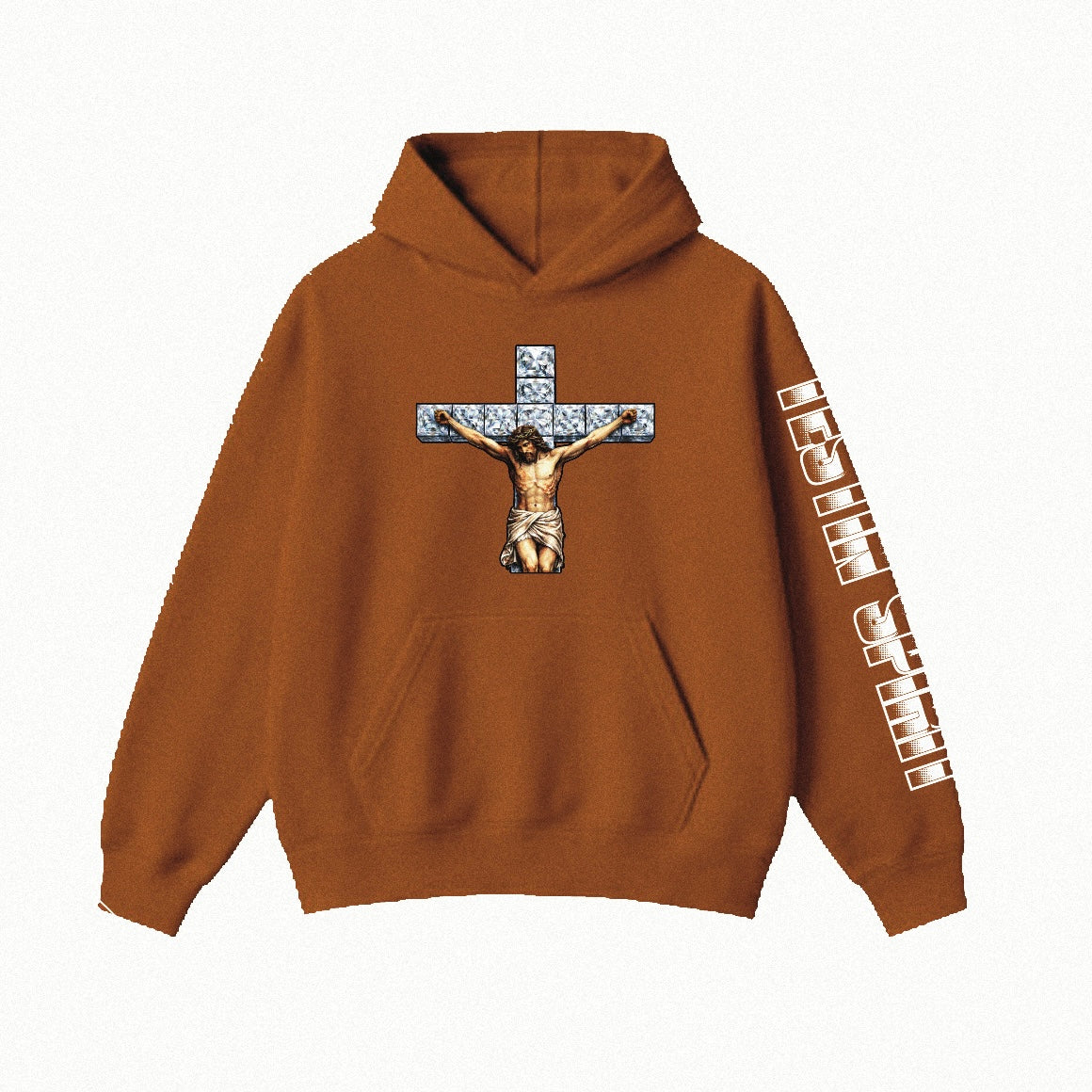 A crucifix graphic placed on a diamond cross symbolizes the weight of sin and the strength to rise above it.
